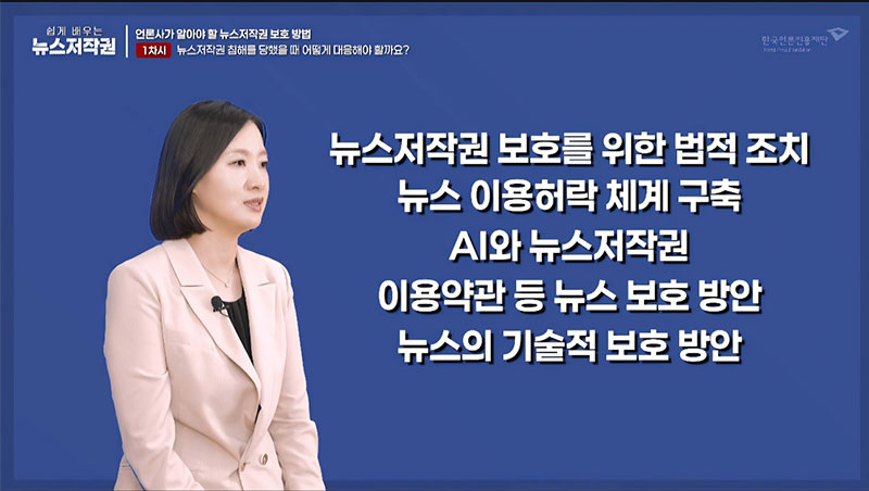 법무법인 민후 양진영 변호사는 한국언론진흥재단에서 운영하는 온라인 강좌 플랫폼에서 '쉽게 배우는 뉴스 저작권'을 주제로 온라인 강의를 진행합니다.