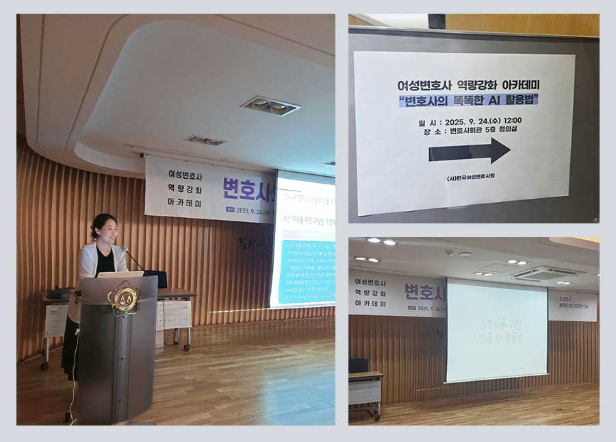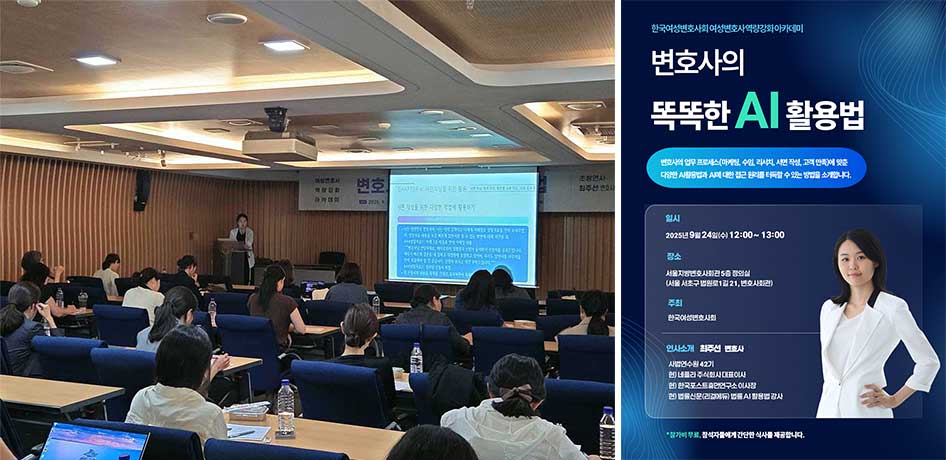 지난 9월 24일, 한국여성변호사회가 주최한 "여성변호사 역량강화 아카데미"에서 법무법인 민후의 최주선 변호사는 "변호사의 똑똑한 AI활용법"이라는 주제로 강연을 진행하였습니다.