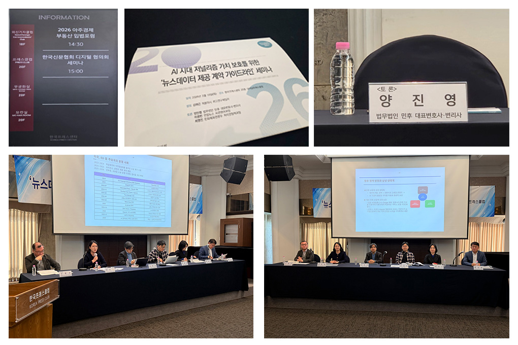 이러한 흐름 속에서 지난 3월 19일, 법무법인 민후의 양진영 대표변호사가 한국신문협회 디지털협의회에서 주최한 [AI 시대 저널리즘 가치 보호를 위한 뉴스데이터 제공 가이드라인 세미나]에 토론자로 초빙되어 심도 있는 논의를 진행하였습니다.